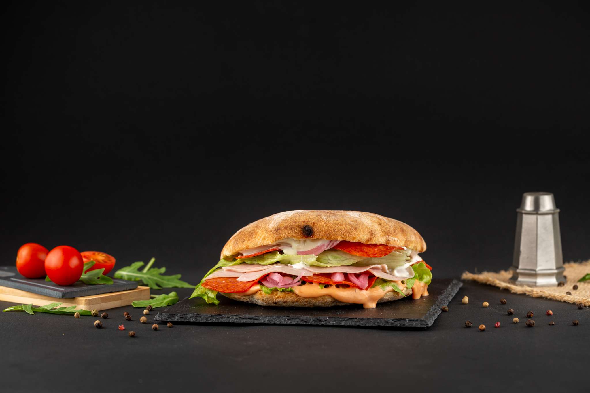 pită, sos tutti, sos usturoi, salam, sunca, mozzarela, ceapa, rosii, castravete murat, salata iceberg