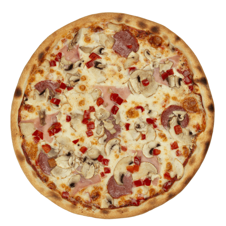 sos rosii, mozzarella, sunca, salam, ciuperci, gogosar