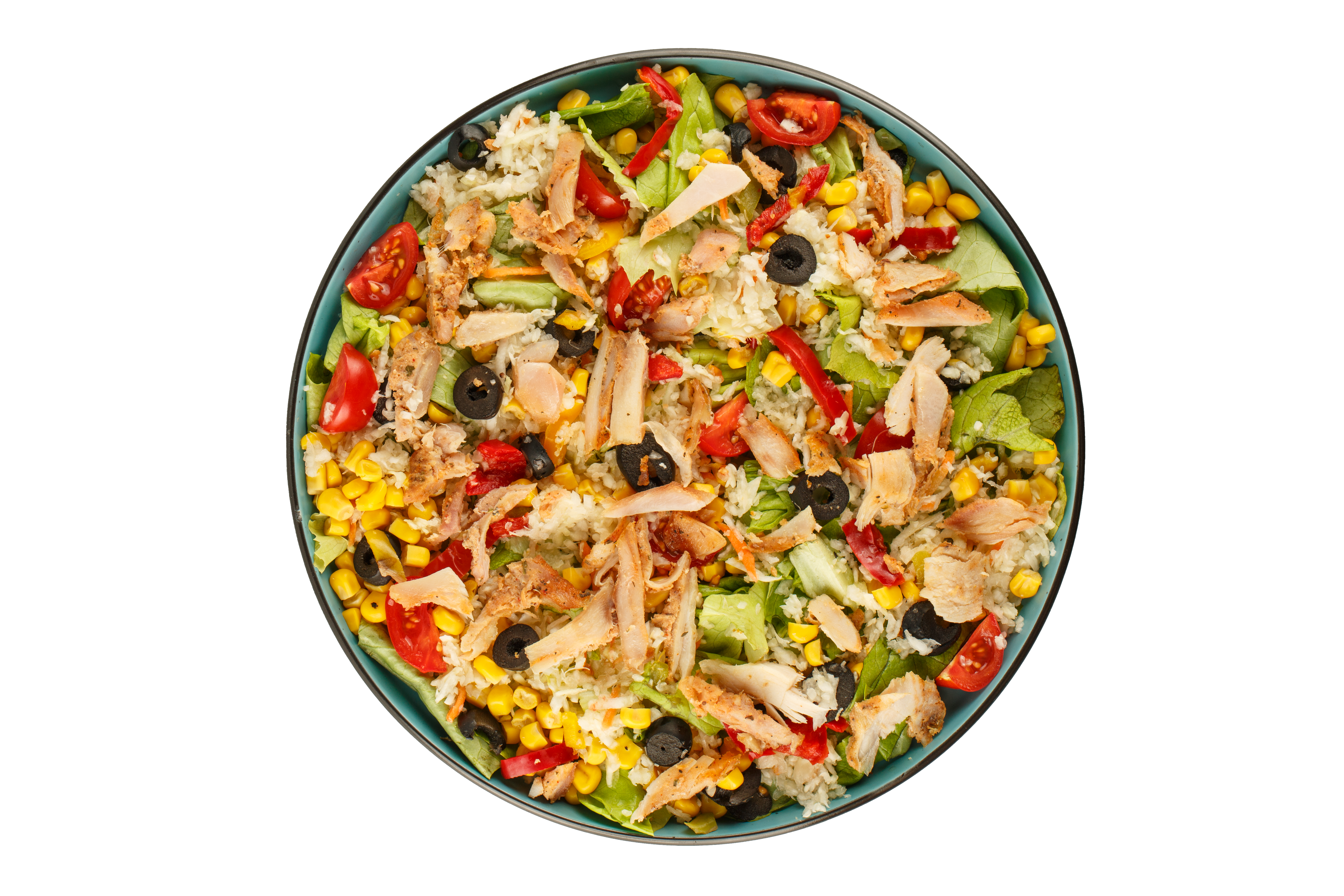 salată verde, varză, porumb, măsline, ardei, roșii, carne kebab pui, dressing