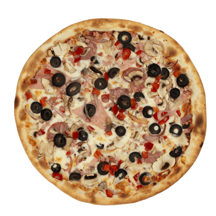 sos rosii, mozzarella, sunca, salam, bacon, ciuperci, gogosar, masline, ceapa