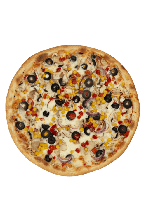 sos rosii, mozzarella, ciuperci, gogosar, masline, porumb, ceapa